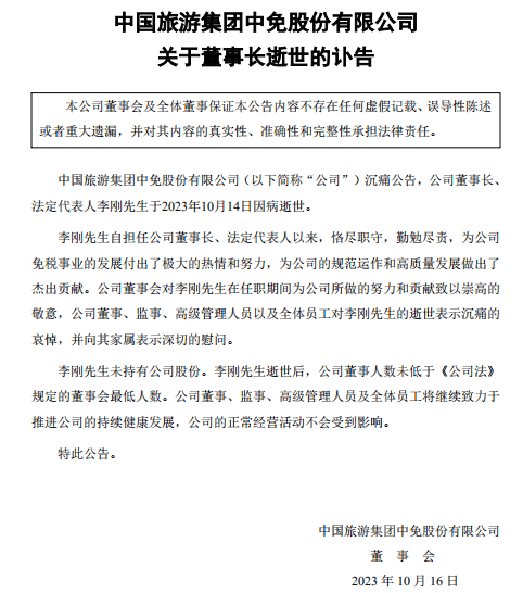 今天(10月16日),中国旅游集团中免股份有限公司(以下简称“中国中免”)发公告,其董事长、法定代表人李刚先生于2023年10月14日因病逝世。