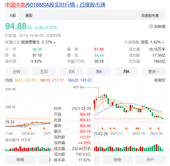 如今,股价已下滑至不到95元的中国中免,何时才能恢复往日“免税茅”的荣光?