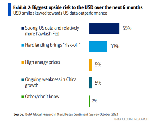 接受调查的基金经理表示,美国强劲的经济数据,加上美联储比其他主要央行相对更强硬,可能是支持美元进一步走强的最可能原因。