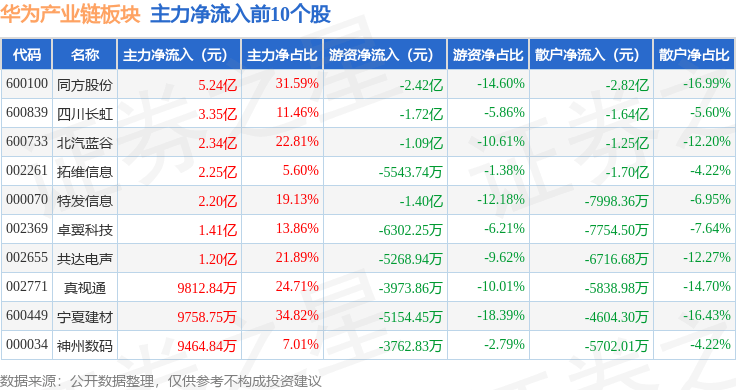从资金流向上来看,当日华为产业链板块主力资金净流出112.61亿元,游资资金净流入16.91亿元,散户资金净流入95.7亿元。华为产业链板块个股资金流向见下表: