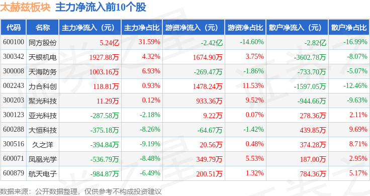 从资金流向上来看,当日太赫兹板块主力资金净流入2.24亿元,游资资金净流出1.42亿元,散户资金净流出8188.98万元。太赫兹板块个股资金流向见下表: