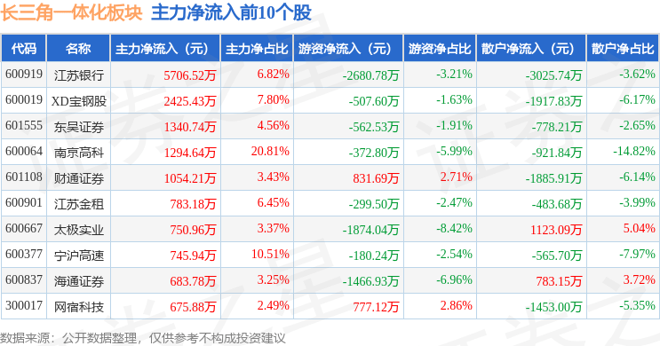 从资金流向上来看,当日长三角一体化板块主力资金净流出14.96亿元,游资资金净流入2.12亿元,散户资金净流入12.84亿元。长三角一体化板块个股资金流向见下表: