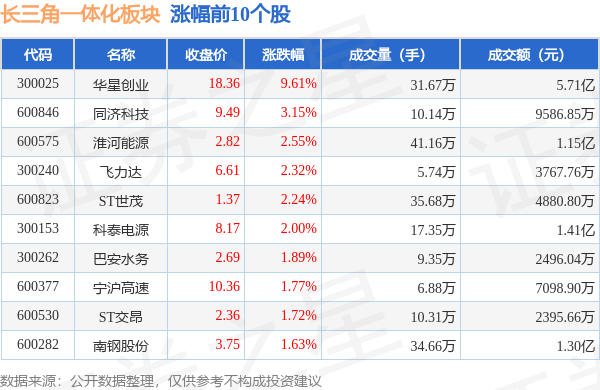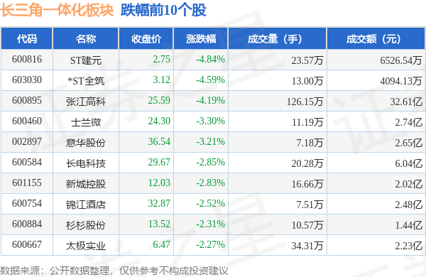 证券之星消息,10月16日长三角一体化板块较上一交易日下跌0.77%,ST建元领跌。当日上证指数报收于3073.81,下跌0.46%。深证成指报收于9924.92,下跌1.42%。长三角一体化板块个股涨跌见下表: