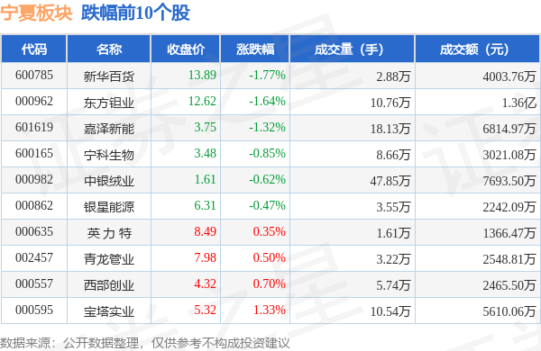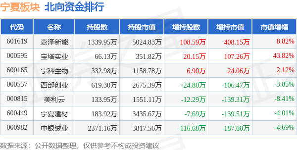 北向资金方面,当日宁夏板块北向资金持股市值为1.8亿元,减持33.42万元。其中增持最多的是嘉泽新能,增持了408.15万元。减持持最多的是中银绒业,减持了187.6万元。宁夏板块北向资金持股变动明细见下表: