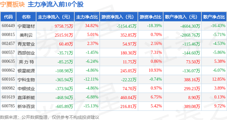 从资金流向上来看,当日宁夏板块主力资金净流入7820.36万元,游资资金净流出5364.73万元,散户资金净流出2455.64万元。宁夏板块个股资金流向见下表: