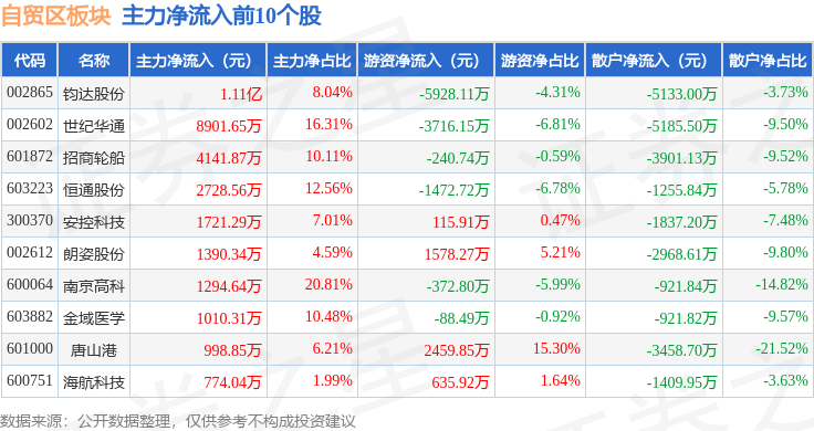 从资金流向上来看,当日自贸区板块主力资金净流出7.83亿元,游资资金净流入8664.75万元,散户资金净流入6.96亿元。自贸区板块个股资金流向见下表: