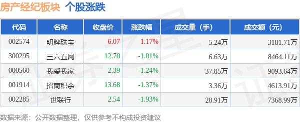 北向资金方面,当日房产经纪板块北向资金持股市值为2.42亿元,减持2.59万元。其中增持最多的是世联行,增持了560.84万元。减持持最多的是我爱我家,减持了461.29万元。房产经纪板块北向资金持股变动明细见下表: