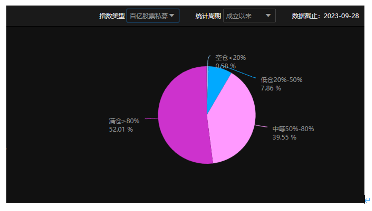 具体来看,满仓(仓位>80%)股票私募占比为57.57%,中等(50%≤仓位≤80%)仓位股票私募占比为31.66%,而低仓(20%≤仓位<50%)和空仓(仓位<20%)股票私募占比分别仅为9.92%和0.85%。