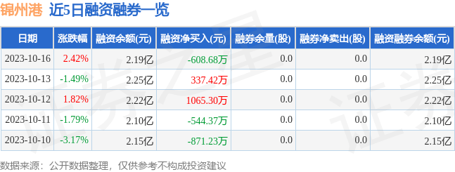 锦州港融资融券信息显示,融资方面,当日融资买入2415.14万元,融资偿还3023.82万元,融资净偿还608.68万元。融券方面,融券卖出0.0股,融券偿还0.0股,融券余量0.0股,融券余额0.0万元。融资融券余额2.19亿元。近5日融资融券数据一览见下表: