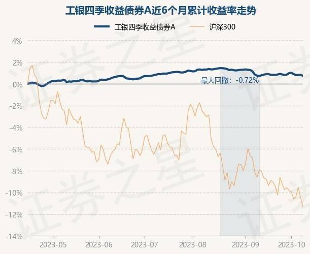 证券之星消息,10月16日,工银四季收益债券A最新单位净值为1.0804元,累计净值为1.8146元,较前一交易日下跌0.06%。历史数据显示该基金近1个月上涨0.55%,近3个月上涨1.07%,近6个月上涨1.43%,近1年上涨1.98%。该基金近6个月的累计收益率走势如下图: