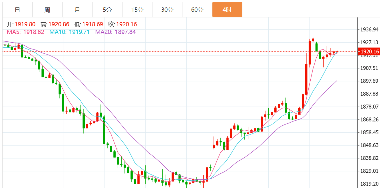 黄金技术面分析:黄金上周五受消息面的影响手头肆意上行,最高触及到1930一线后暂时止步,而日内开盘后陷入了回撤的局面,并且于欧盘最低触及到1908附近后继续上扬,而反抽的幅度也是比较迅速,那么目前而言,多头的余温仍然存在,然在这种形态之下,短线内我们还是可以尝试性回踩做多等待,毕竟在大幅度的上冲以来,多数的能量还是取决了消息面的支撑,随着局势继续发展,则后期回踩有望继续上扬。从4小时周期图的形态上看,金价持续处于保持高低点不断抬高的多头上涨趋势阶段中,周线收取一根光头阳线,代表上涨趋势较强。日线以及4小时层面上,金价均明显偏离均线过远,有回调需求。金价自1930关口上方震荡回落,目前已跌至1920下方,短线可以看1900-1905支撑;短线做多!长线做空!