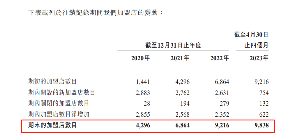 招股书显示,在2020年底锅圈食品加盟店数量已经达到4296家,2021年增至6864家,2022年已经扩张到全国9216家,截至今年4月底,全国加盟店数量已经达到9838家,远超国内火锅店。