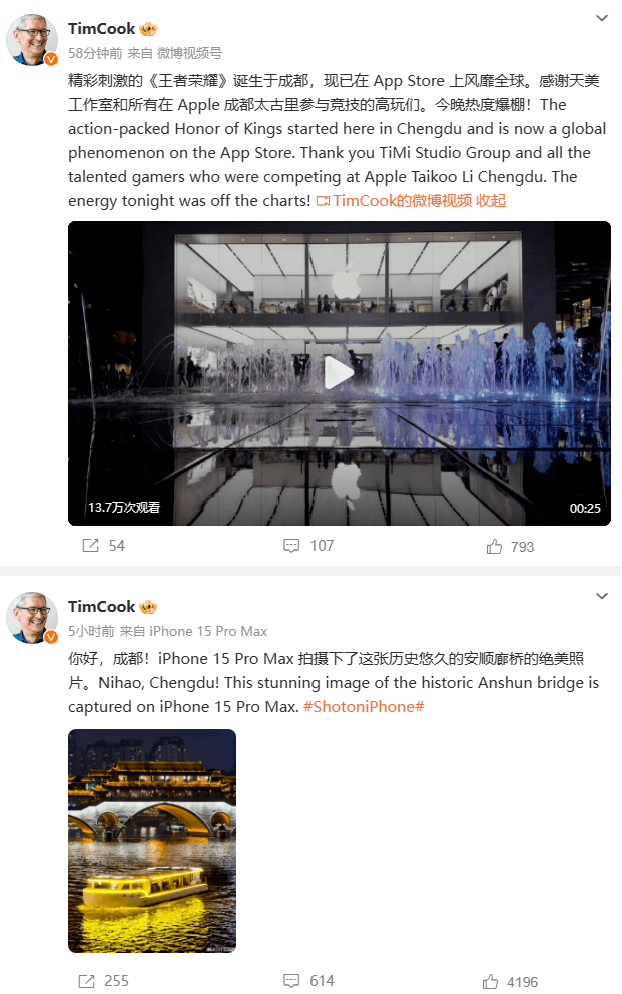 10 月 16 日消息,苹果 CEO 库克微博账号发文宣布到访成都,并附上一张由 iPhone 15 Pro Max 拍摄的安顺廊桥,「你好,成都!iPhone 15 Pro Max 拍摄下了这张历史悠久的安顺廊桥的绝美照片。」