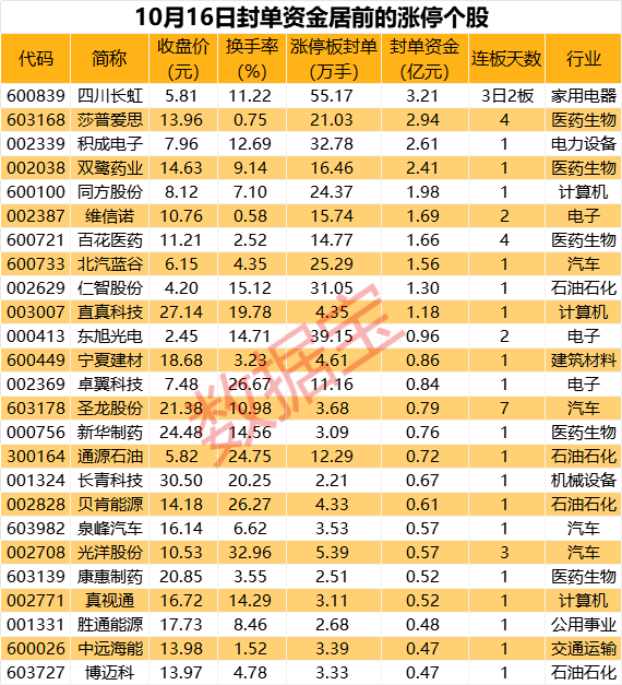 以封单金额计算,10股封单金额超亿元,其中四川长虹、莎普爱思、积成电子封单资金居前,分别为3.21亿元、2.94亿元、2.61亿元。