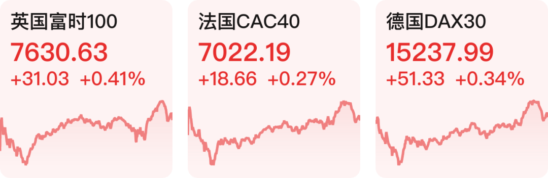 欧洲三大指数全线上涨。截至收盘,英国富时100指数涨0.41%,法国CAC40指数涨0.27%,德国DAX30指数涨0.34%。