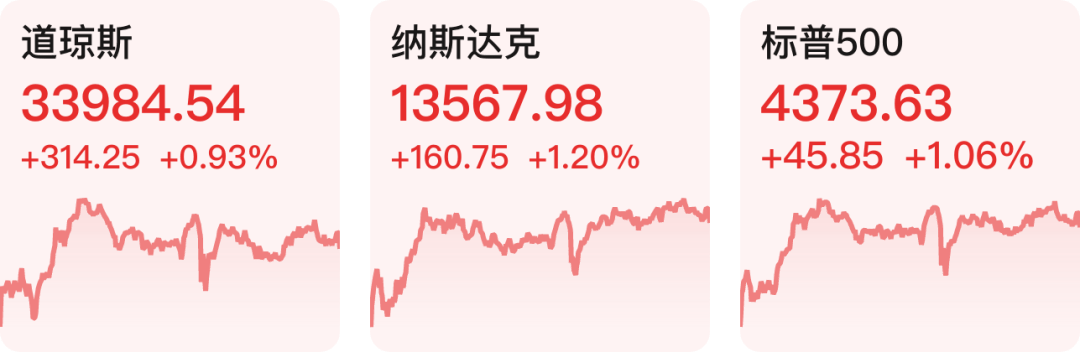 美股三大指数全线上涨。截至收盘,道琼斯指数涨0.93%,纳斯达克指数涨1.2%,标普500指数涨1.06%。热门科技股普涨,亚马逊、Meta涨超2%,微软、谷歌、英伟达、特斯拉涨超1%。热门中概股涨跌不一,好未来涨近7%,腾讯音乐涨近6%,京东涨超2%。
