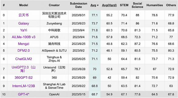 9月,学术界当红开源评测榜单C-Eval最新一期排行榜中,云天励飞的大模型“云天书”排在第一,而GPT-4仅名列第十。