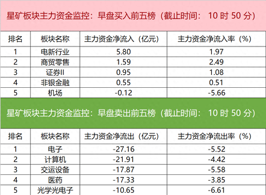 【主力资金监控:电子板块净流出超27亿元】财联社10月17日电,财联社星矿数据显示,今日早盘主力资金净流入电新行业、商贸零售、证券Ⅱ等板块,净流出电子、计算机、交运设备等板块,其中电子板块净流出超27亿元。个股方面,N陕华达大涨,主力资金净买入3.66亿元,中贝通信、通化金马、恩捷股份获主力资金净流入居前;四川长虹遭净卖出超7亿元,拓维信息、同方股份、北汽蓝谷主力资金净流出额居前。