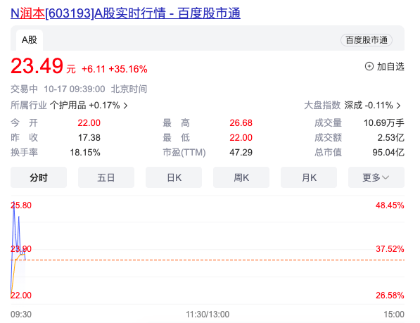 10月17日,润本生物技术股份有限公司(以下简称“润本生物”或“公司”)登陆上交所主板上市,发行价格17.38元/股,开盘涨26.58%至22元/股;截至发稿前,每股为23.49元,涨幅达35.16%,总市值95.04亿。