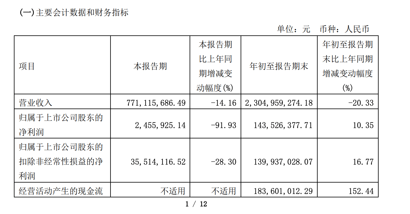 今年第三季度,营业收入为7.7亿元,同比减少14%,Wind数据显示,连续十个季度营收数据同比下滑;归属于上市公司股东的净利润为245.5万,同比下降91%,单季净利润下降幅度扩大。