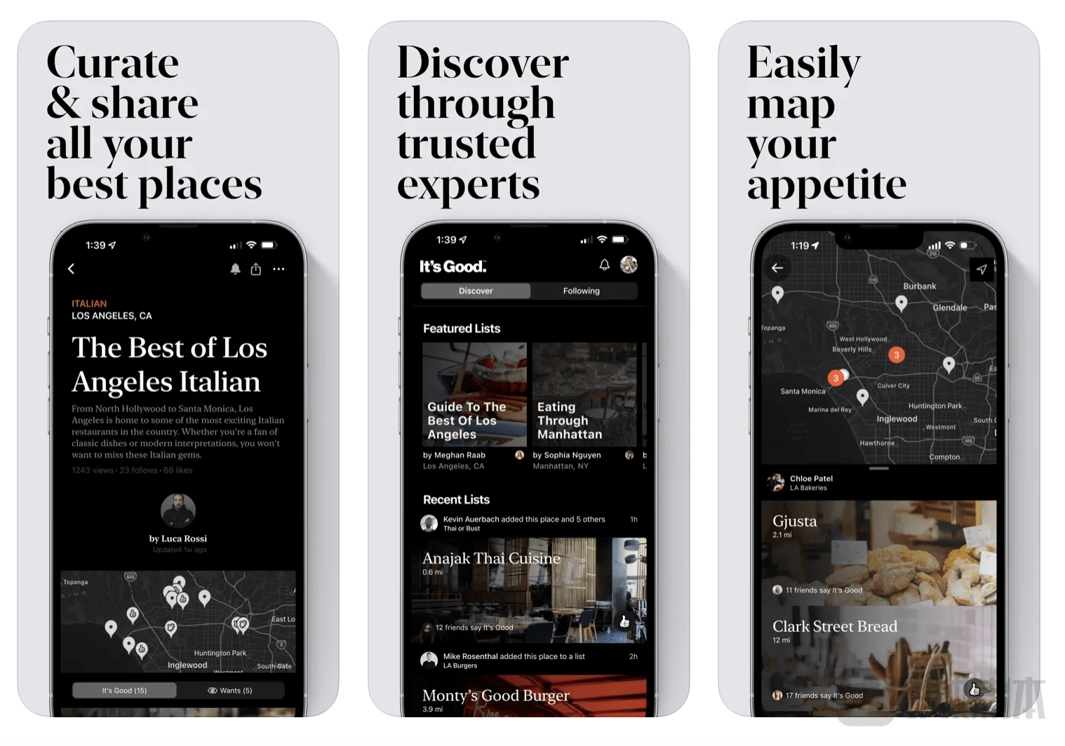 与已经成熟的Yelp,Trip Advisor或Google Reviews等APP聚集了大量陌生人评分和评论不同的是,新上线的“It’s Good”想走的一条差异化路线是,通过值得信赖的专家或者周围熟悉朋友构建的社区来探索世界,目前聚焦在美食餐厅和旅行领域。