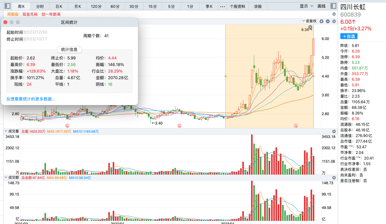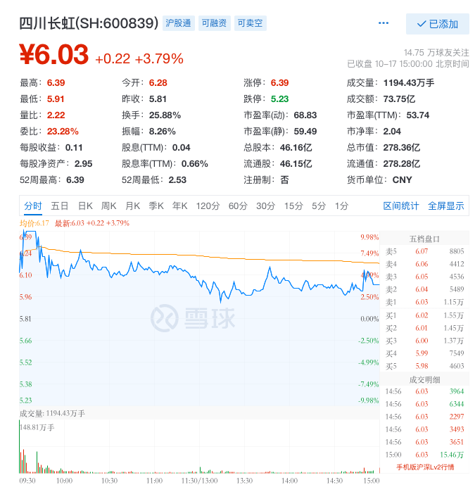 10月17日,四川长虹高开、报6.28元,涨幅达8.08%;之后盘中涨停报6.39元,午后股价有所回落,收报6.03元、涨幅为3.79%,总市值约为278.36亿元。