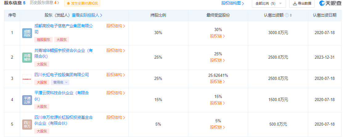 根据天眼查数据,华鲲振宇成立于2020年,股东包括成都高投、共青城华鲲振宇、四川长虹、平潭云辰和申万长虹。其中,成都高投持股比例为30%,系其控股股东。