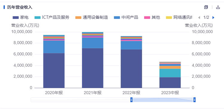 家电依旧是四川长虹的第一大收入来源,据同花顺数据显示,2020年-2022年分别为621.1亿元、708.63亿元和687.17亿元,占其总营收的比重为65.76%、71.13%和74.3%。