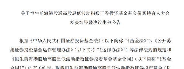2023年9月27日,恒生前海基金公告称,基金份额持有人大会召开成功,恒生前海港股通高股息指数基金的终止运作议案获得通过,基金于2023年9月28日起终止运作,并进入清算程序。目前,该基金还在清算中。
