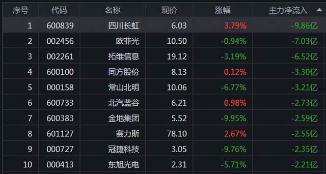 今日主力资金净流出前10只股: