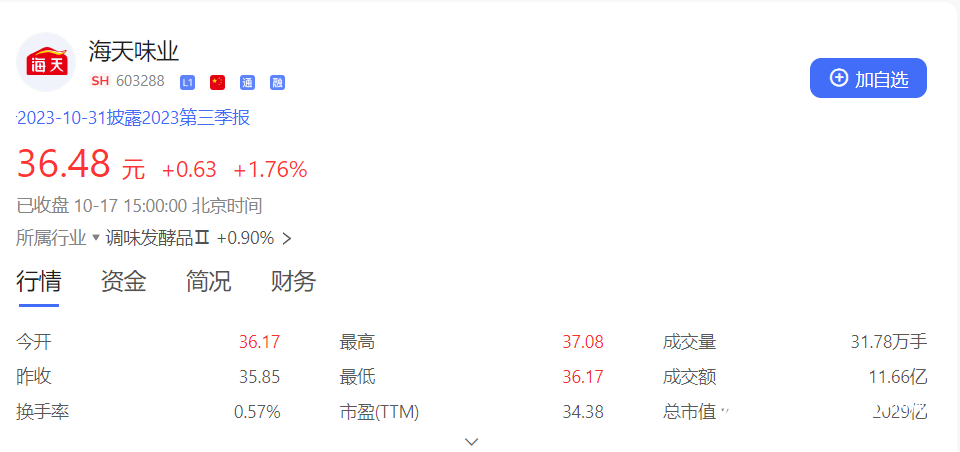 截至10月17日收盘时,海天味业股价略有回升1.76%,报36.48元。