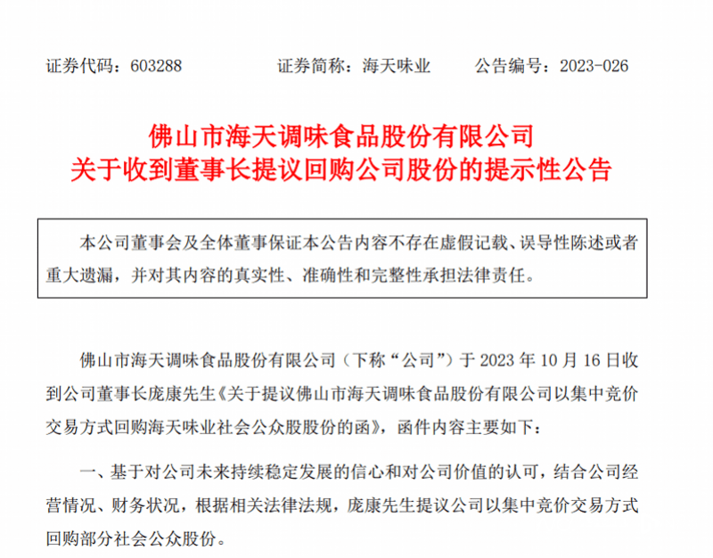 10月16日晚间,调味品行业龙头海天味业发布公告称,收到一则公司董事长庞康发布的《关于提议佛山市海天调味食品股份有限公司以集中竞价交易方式回购海天味业社会公众股股份的函》。