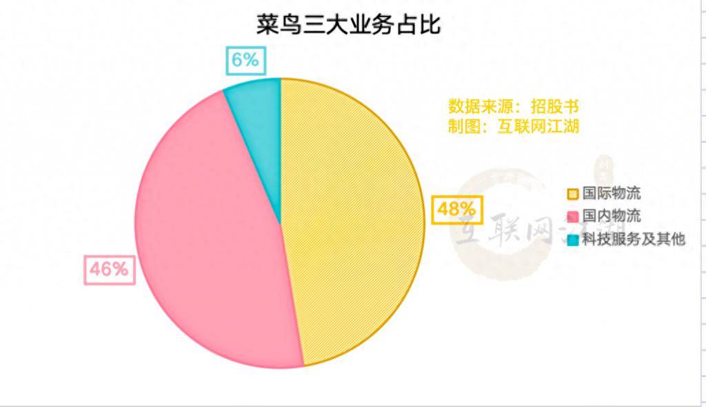 菜鸟 APP 的确有 6 亿用户,日活月活表现也都不差,但实事求是地讲,三大业务占比重,国际物流占到 47.4%,国内物流占到了 46.2%,而科技以及其他服务业务占比仅有 6.4%。