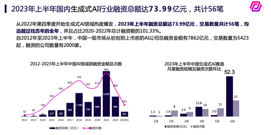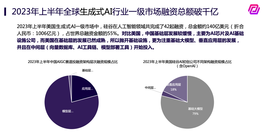 “2023年上半年,中国生成式AI行业融资总额达到73.99亿。美国生成式AI一级市场中,硅谷共融资42次,总金额为140亿美元。国内73.99亿元的规模,相当于硅谷的7%。”
