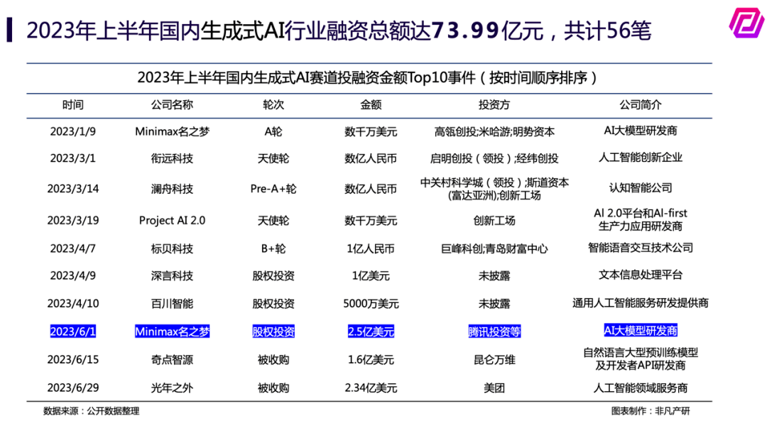 我们再聚焦看,上图列出了AI赛道投融资事件Top10。Minimax名之梦公司是一匹黑马,从融资总额上看,它是创业公司里,或者说非巨头做大模型领域里融资金额最高的一家,并且获得了腾讯投资的投资。