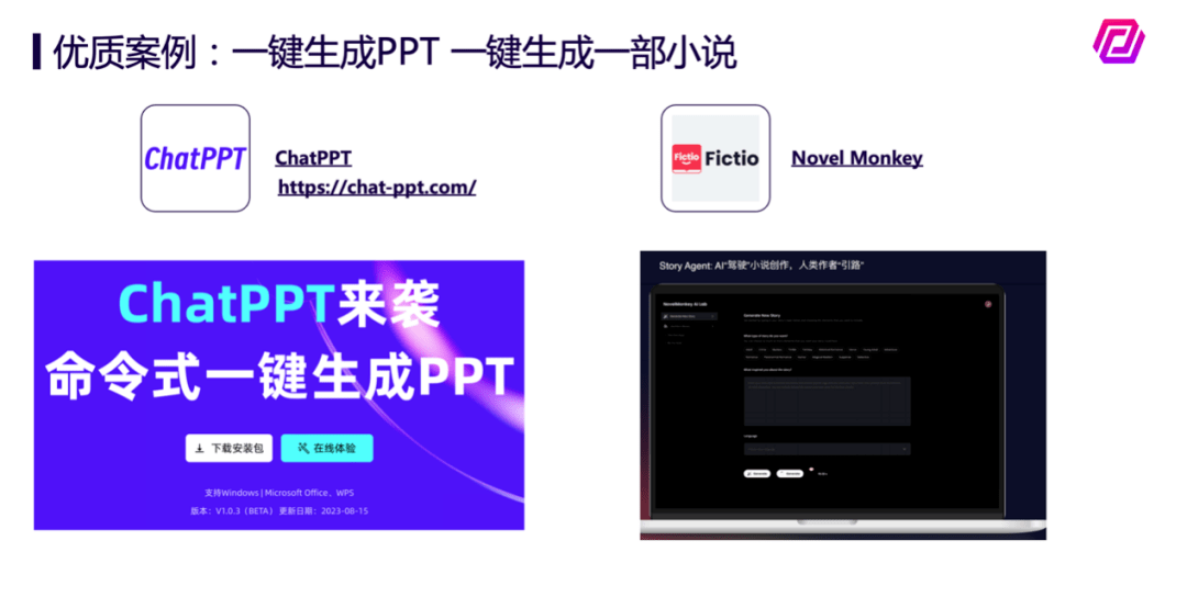 “我想分享一些当前中国创业者开创的一些创新性AI实际应用:比如ChatPPT,是一键生成PPT演示文稿的工具,他们的数据表现非常出色,目前付费用户已经超过万人,这意味着已经实现了百万元的产品服务收入,这在目前的市场中是相当罕见的。”非凡资本合伙人胡小婧说。