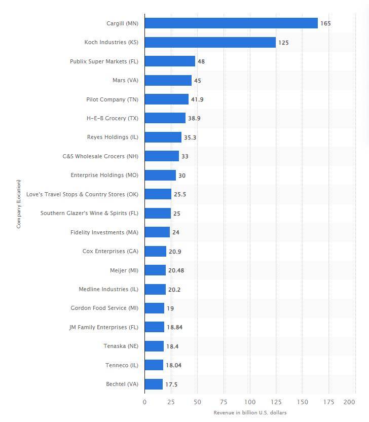 除此之外,美国还存在许多未上市的私营公司,实力强悍。比如全球第一大粮食贸易商嘉吉(Cargill)、糖果巨头玛氏(Mars)、全美最大卡车服务站连锁运营商Pilot、大众超级市场(Publix Super Markets)、雷耶斯控股(Reyes Holdings)、H-E-B连锁超市等等。