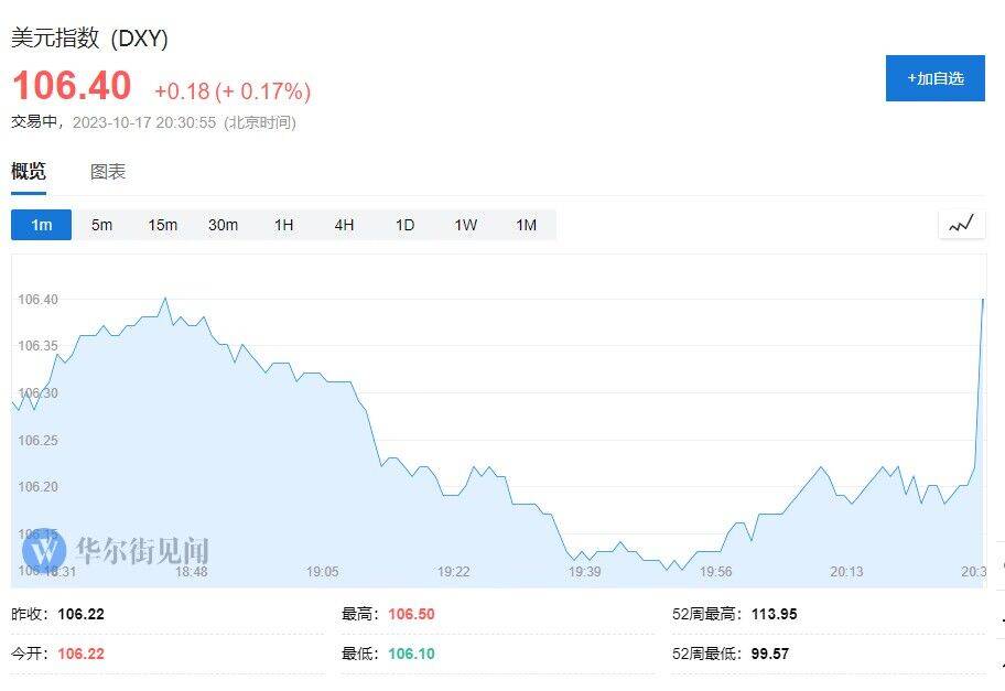 数据发布后,美元指数短线拉升约20点,现报106.40。美股期货短线走低,纳斯达克100指数期货跌幅扩大至0.6%。