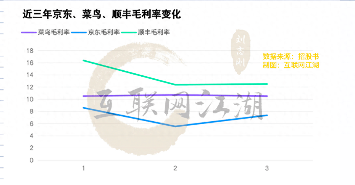 2021到2023财年,菜鸟的毛利率分别为10.5%、10.7%以及10.5%,京东20年到22年的毛利率分别为8.58%、5.52%以及7.35%,顺丰同期毛利率分别为16.35%、12.37%以及12.49%。