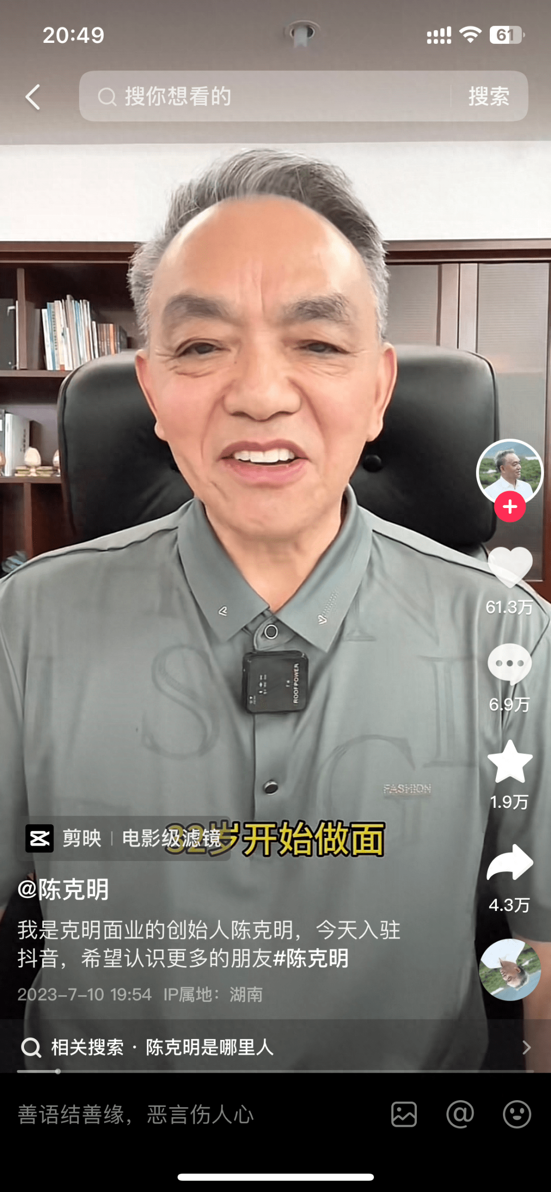 今年71岁的“面条大王”陈克明在7月10日开通了个人抖音账号,并发布了他的第一条视频。他在视频中告诉大家,为了实现自己有生之年还能再做一家上市公司的梦想,秉承着“学到老活到老”的理念,因此选择入驻抖音。截至目前,这条抖音评论数近7w。