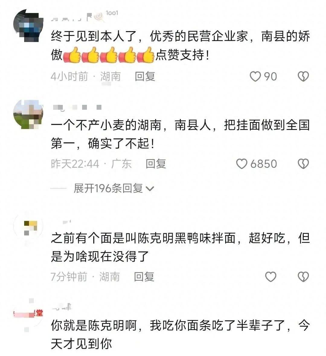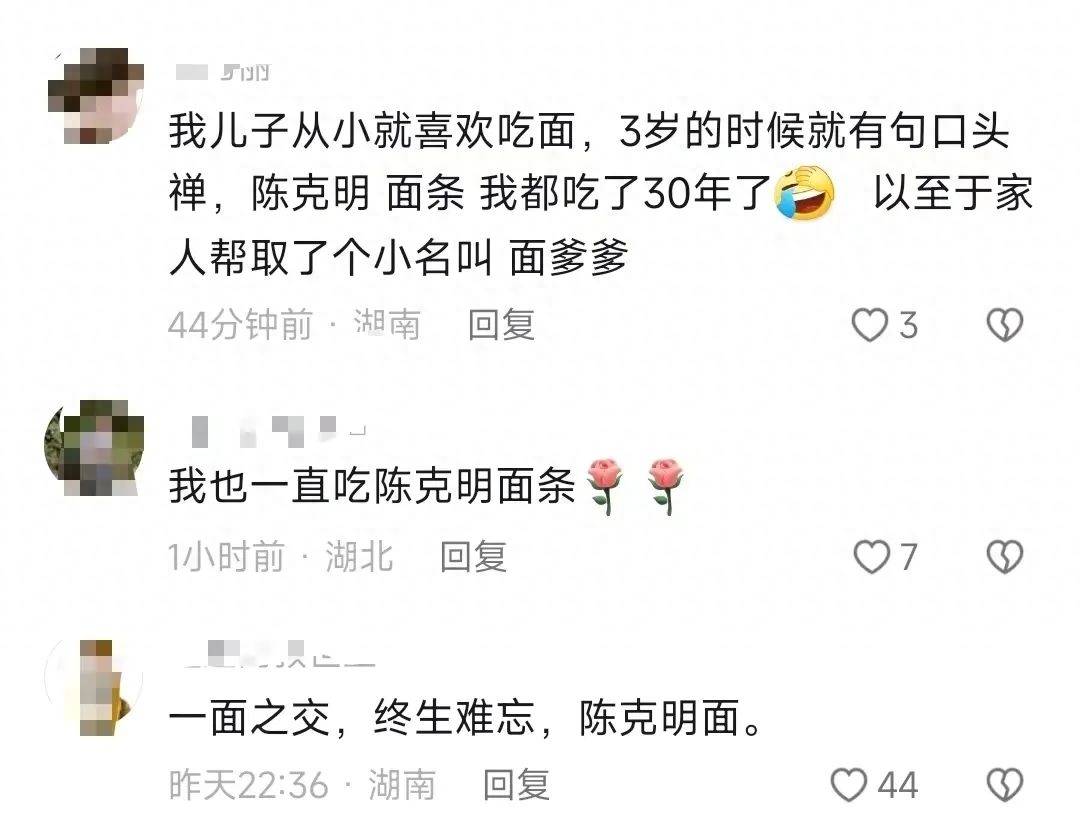 天南海北的网友纷纷在评论区留言“你就是陈克明啊,吃你面条半辈子了,今天才见到你。”“陈克明已经不是人名了,是品牌,是湖南的品牌,是中国的品牌,是世界的品牌!我一个东北人买面条只知道陈克明一个品牌了!”