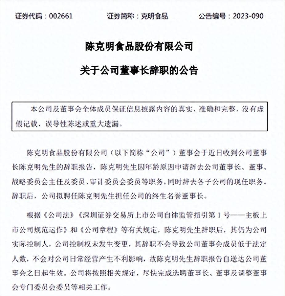 10月17日,克明食品发布公告称,公司董事会于近日收到董事长陈克明的辞职报告,因年龄原因申请辞去公司董事长、董事、战略委员会主任及委员、审计委员会委员等职务,同时辞去各子公司的现任职务。辞职后,公司拟聘任陈克明担任公司终生名誉董事长。