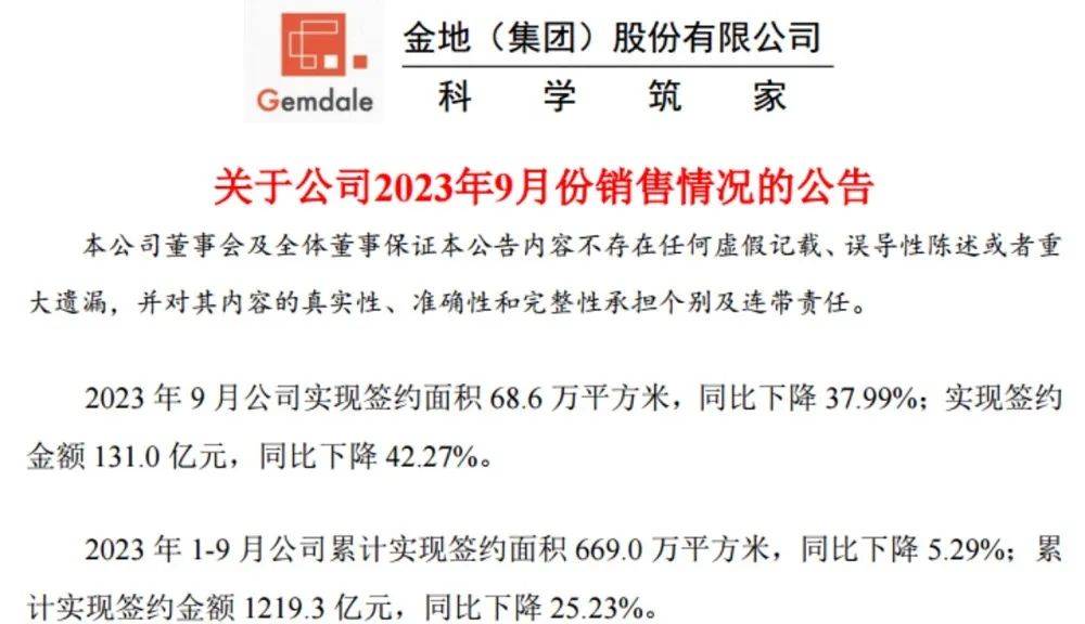 10月10日公司公告的1到9月销售数据则显示,金地集团实现签约金额1219.3亿元,同比下降25.23%。