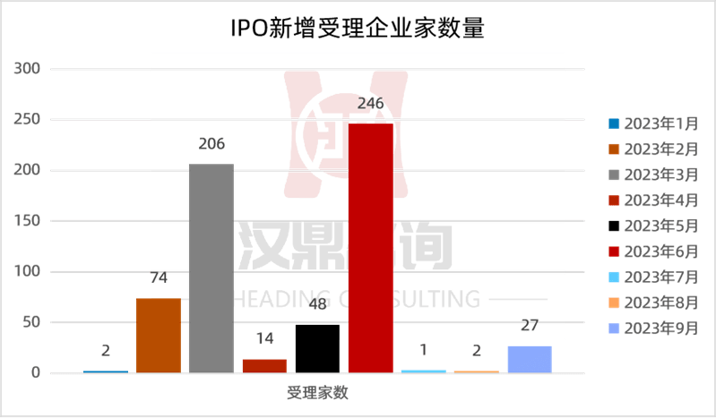 在IPO阶段性收紧的政策背景下,真实的IPO受理情况如何变化?为了更好地了解IPO市场情况变化,汉鼎咨询课题组对近期IPO新增受理数量进行了统计和分析。