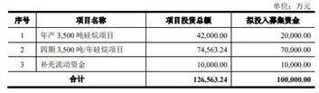 硅烷科技发行不超过本次发行前总股本的30%,即不超97398477股(含本数)。募集资金总额不超过10亿元(含10亿元),扣除发行费用后拟将募集资金全部用于年产3500吨硅烷项目、四期3500吨/年硅烷项目、补充流动资金。