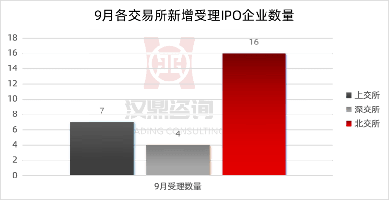 从9月数据具体来看,北交所新增受理16家,受理数量远高于沪深交易所,占总体受理比例59.3%。虽然IPO阶段性收紧,但北交所在政策红利、发展潜力加持下,申报热度不减。