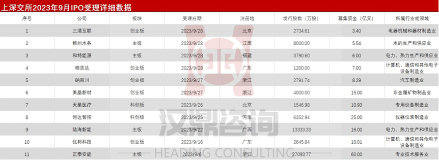 (一)9月沪深交易所新增受理IPO企业共计11家,多为国家战略支持行业