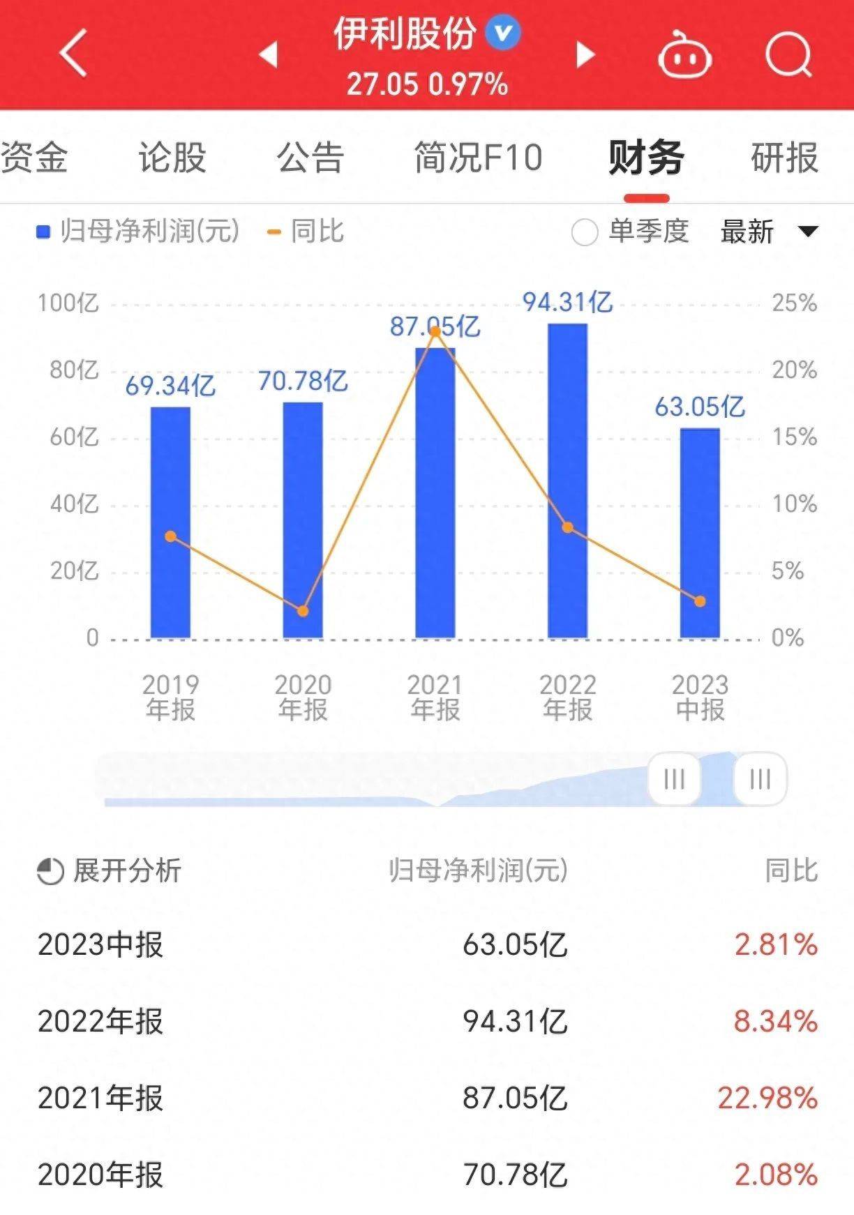 虽然增速较慢,但是比起另外一位老大哥,蒙牛,还是相当不错的。蒙牛乳业2023年上半年实现营业收入511.2亿元,同比增长7.12%,实现净利润30.2亿元,同比下降19.48%,利润不及伊利股份同时期净利润的一半。