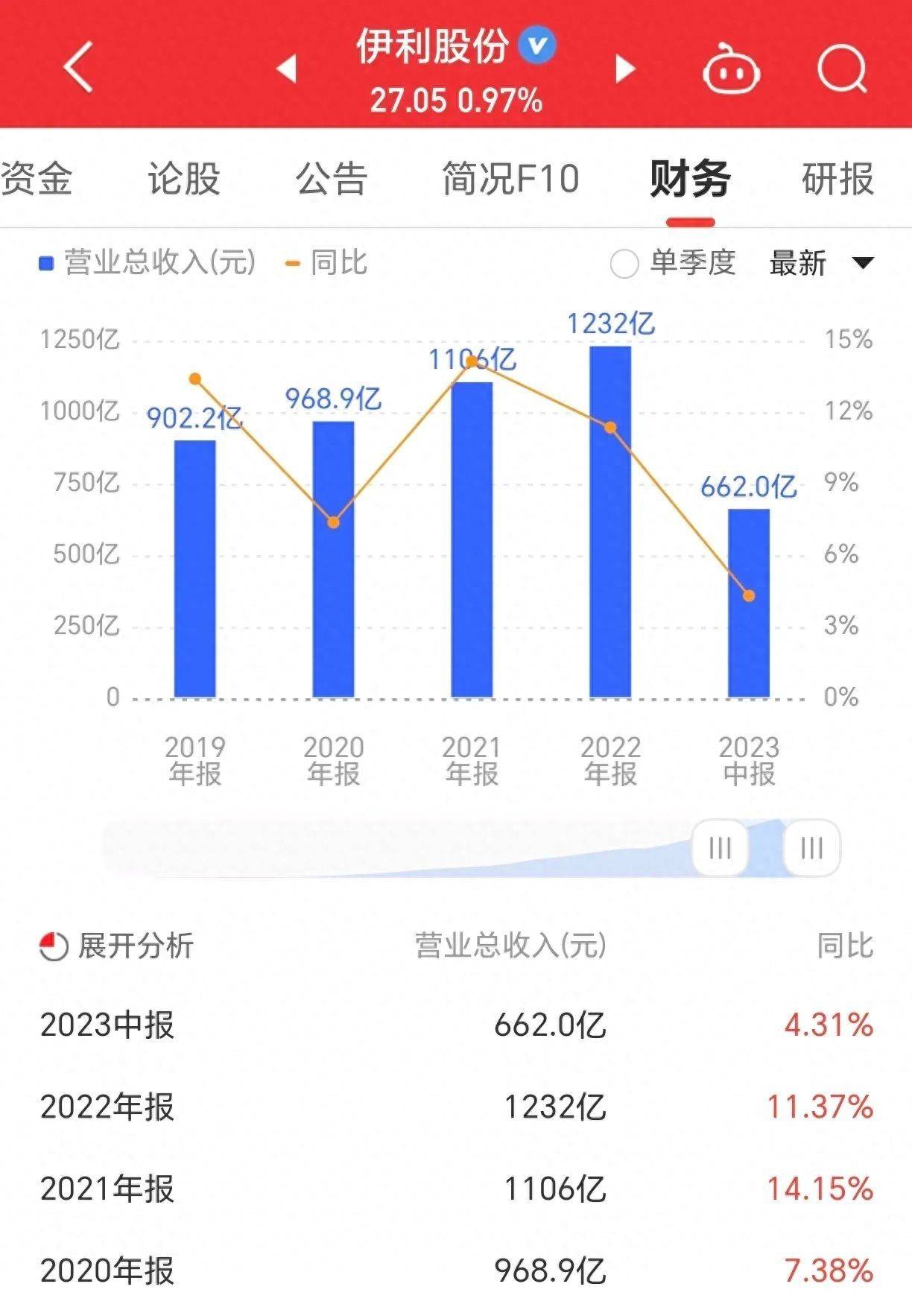 伊利股份全称是内蒙古伊利实业集团股份有限公司。同花顺介绍其是雪糕、冰淇淋、超高温灭菌奶连续多年产销量全国第一。1996年上市,至今累计涨幅302倍,在A股市场妥妥的价值投资的标杆。中国奶业市场曾经受到过三聚氰胺事件的影响,但是迷雾散去,行业也呈现出稳定增长。目前伊利股份总市值1722亿元。在细分领域乳业行业忠排名NO 01。