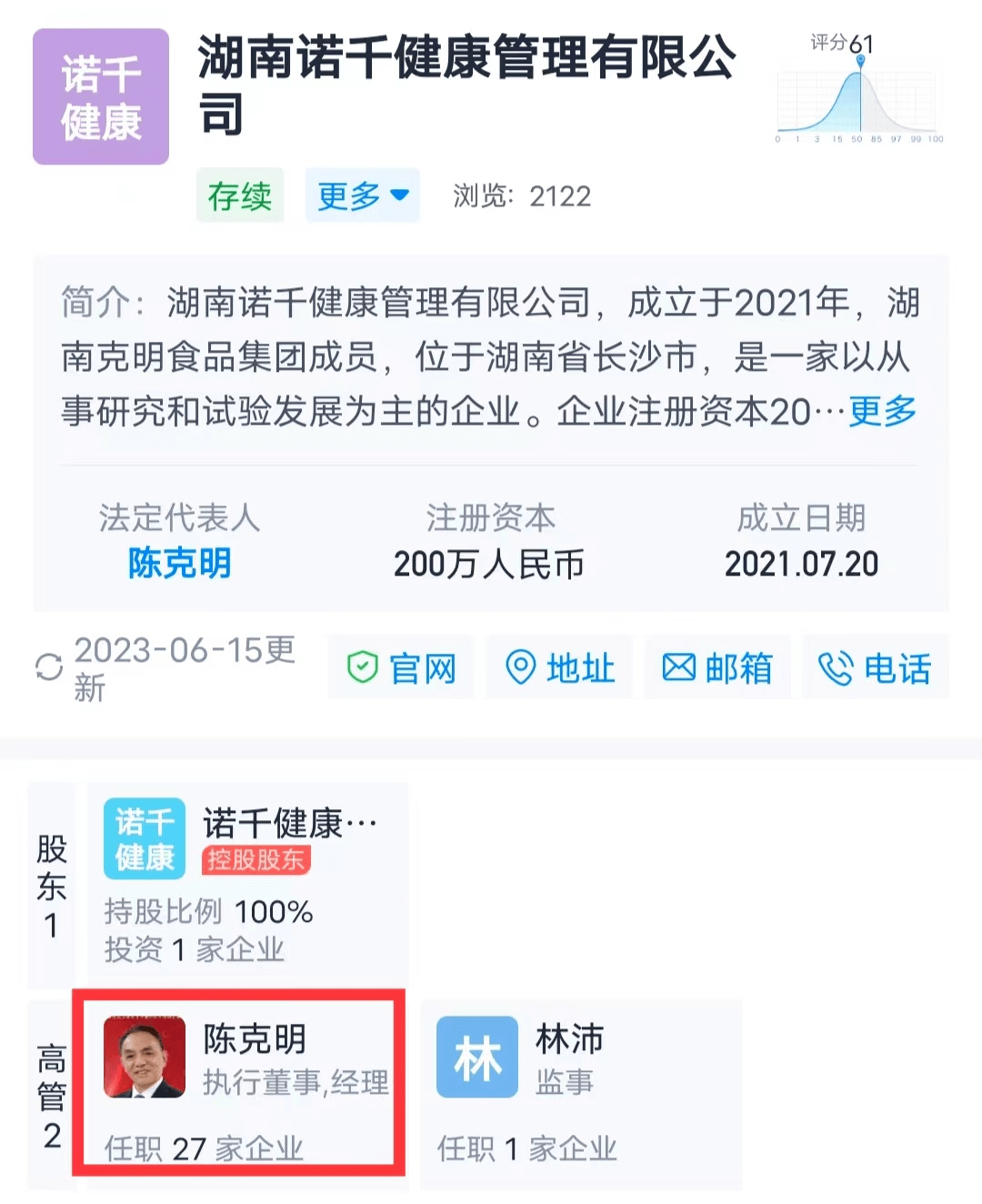 进一步查询则发现,“诺千商城”所属主体为湖南诺千健康管理有限公司(以下简称:诺千健康)。天眼查显示,诺千健康成立于2021年7月20日,经一层股权穿透后由克明集团持股3.74%,由湖南福生源健康咨询合伙企业(有限合伙)持股96.26%,而后者实际控制人正是陈克明。